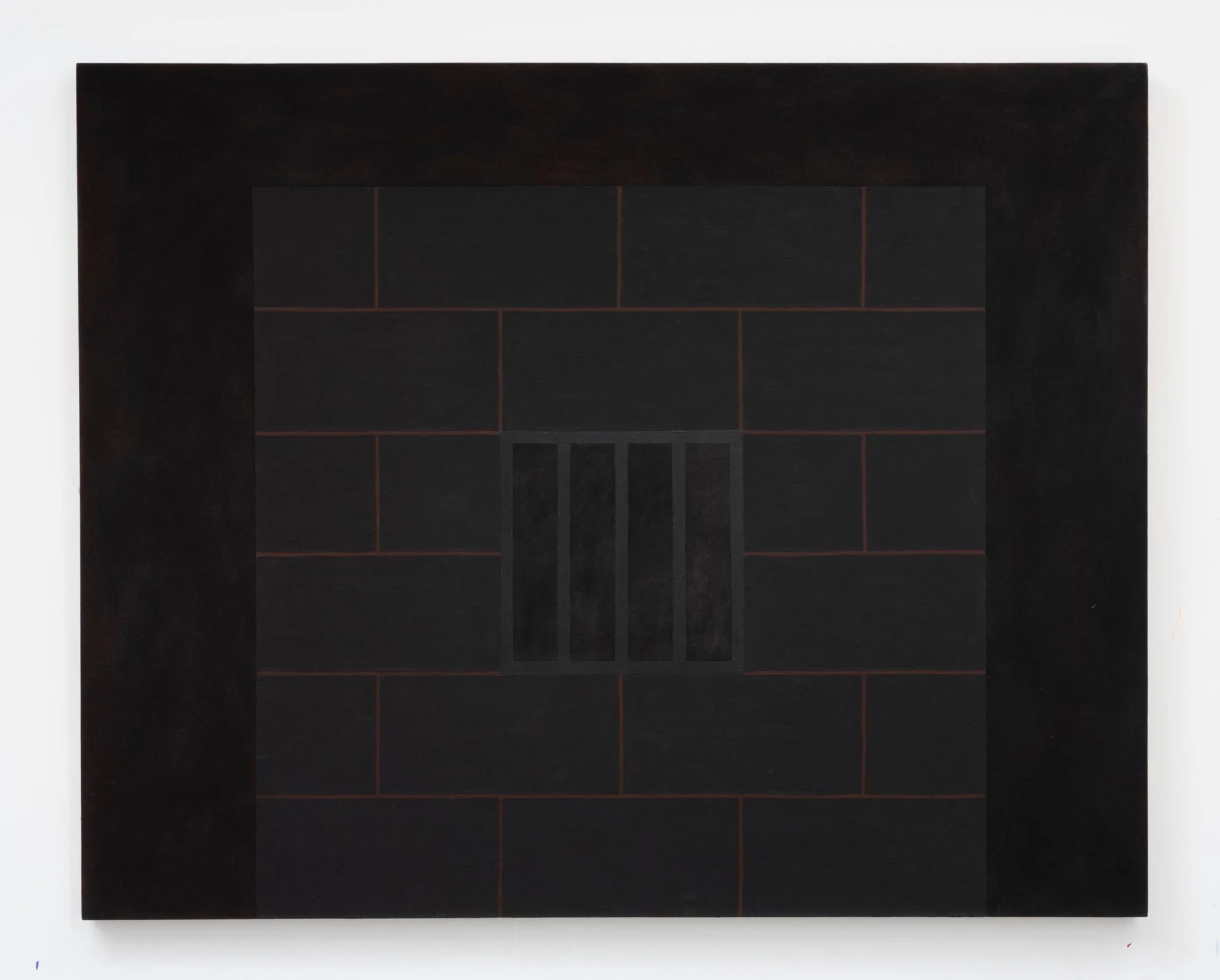 The outermost panels are made of gold-painted, faux bricks cast from polyurethane, reflecting Halley’s long interest in the use of ersatz materials. These brick surfaces harken back to Halley's early paintings of brick walls made in 1980 and 1981.