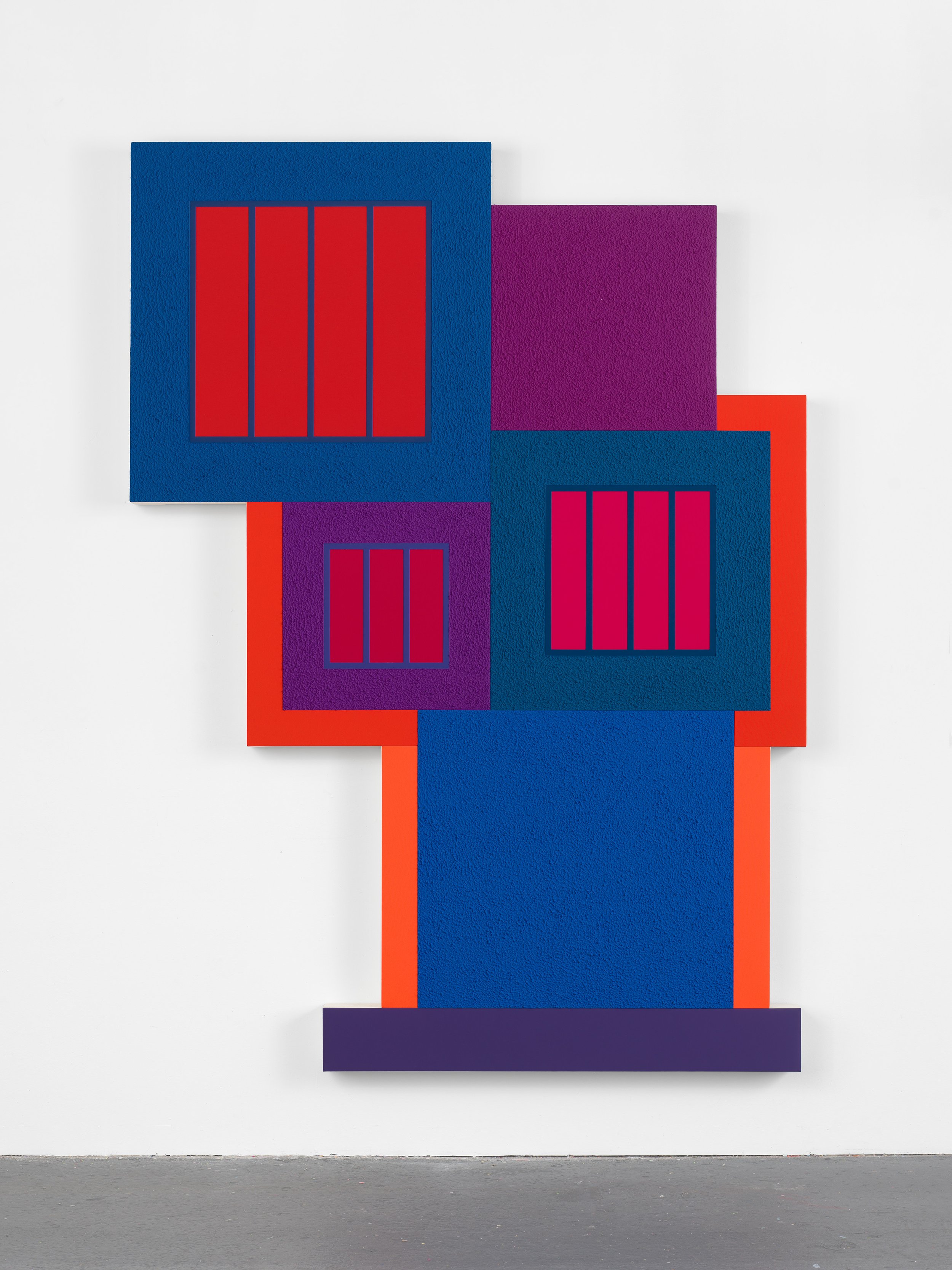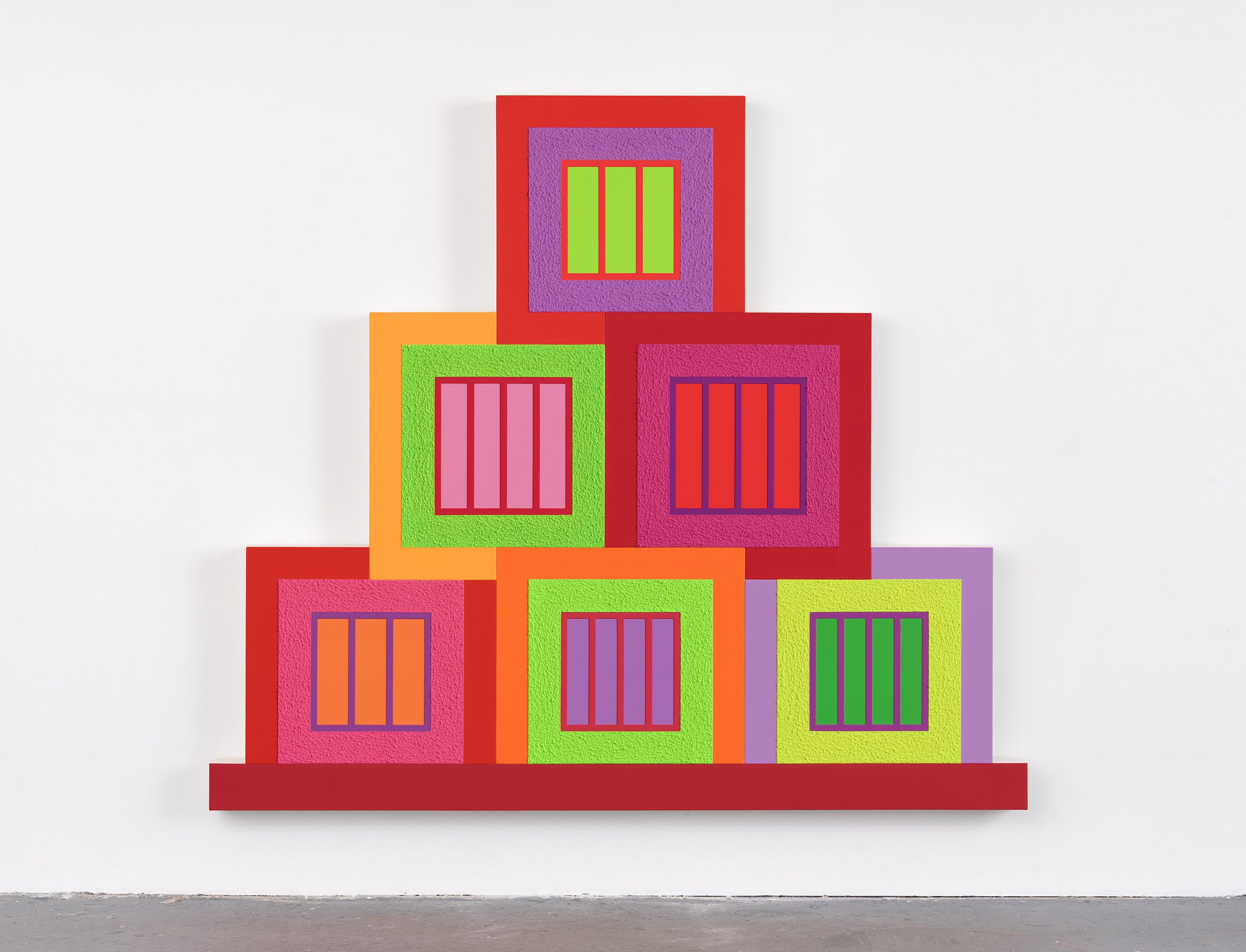 Acrylic, fluorescent acrylic, Flashe, and Roll-a-Tex on canvas